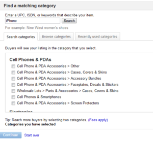 بعدما قمنا بتسجيل حسابنا على إيباي و تم تسجيل عضوية البائع على الشركة , الآن سوف نقوم بإختيار منتج ما مثلاً لكي نبيعه على إيباي , سوف نبيع هاتف أول خطوة سوف نختار التصنيف الخاص بنا و الذي سوف يكون هاتف كما نرى في الصورة .