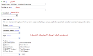 هنا سوف نقوم بملأ البيانات الخاصة بالهاتف ووصفه بشكل دقيق جداً , و شركة إيباي تعتبر صارمة جداً في مثل هذه الأمور و بنفس نظام أمازون , في حالة كان وصفك مخالف لما هو موجود سوف يتم إسترجاع المبلغ الخاص بالمنتوج مباشرةً و للعلم فإدارة إيباي هي نفسها إدارة بايبال كما أسلفنا الذكر لذا من الصعب جداً التلاعب مع الشركة و قوانينها الصارمة , لذا ننصح أن يكون وصف المنتج الخاص بك صحيح و يتطابق مع المنتوج تماماً و هذا كي تتجنب المشاكل المترتبة على هذه الأمور طبعاً .