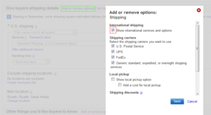 و هذه الصفحة تعتبر من أهم الخطوات , بعد ملئنا للمعلومات الخاصة بالمنتوج الآن أتينا لخاصية الشحن و ما يترتب عليه و في هذه الصفحة سوف نختار طريقة الشحن و التكلفة و غيرها من الأساسيات الهامة جداً و على حسب الدولة التي تقطن فيها بالطبع لكي تكون عملية البيع و الشراء ذات شفافية و دقة كافية تجعلك أحد البائعين المميزين في شركة إيباي .